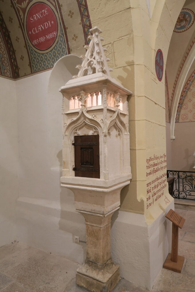 A l’intérieur, un Christ en croix, en bois polychrome, domine l’autel, autour duquel on trouve deux meubles en bois doré, restaurés en 2013, qui portent des sculptures de la Vierge (17ème siècle). Dans les murs, des niches vitrées abritent d’autres sculptures : une représentation en pierre de la Sainte Trinité (15ème siècle ?) et des statues de procession : Saint Nazaire et Saint Celse et Saint Vincent, patron des vignerons. Le vitrail situé au fond derrière l’ancien autel a été restauré aux couleurs symboliques de la vigne, en 1985 (peintre Jean Elvire, maître verrier Jacques Bony). Lors de la dernière restauration, une inscription funéraire du 15ème siècle a été mise en valeur derrière l’autel. Elle jouxte un tabernacle gothique en pierre, de la même époque, encore en usage. Notons encore un grand vitrail, dit « de la Guerre de 14-18 », offert par la famille Benoit, représentant leur fils tué à la guerre, couché au sol, mourant, face à un calvaire, inspiré de celui des Valendons.